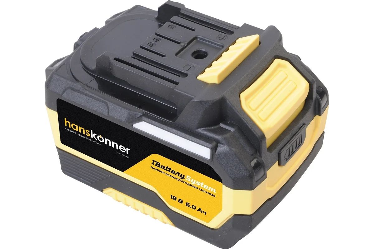 18-вольтовый аккумулятор HBP2006 Hanskonner емкостью 6.0 Ач обеспечивает впечатляющую мощность и совместим с любым инструментом единой аккумуляторной системы 1BatterySystem.