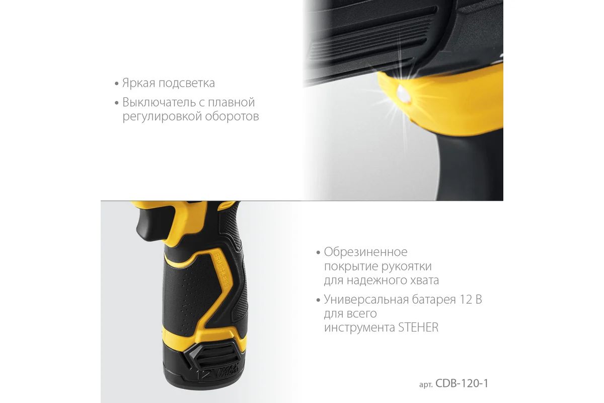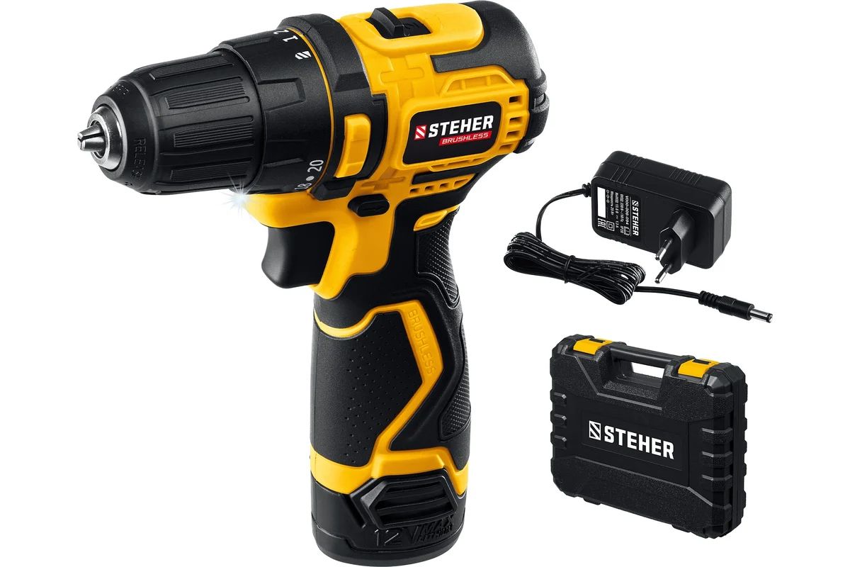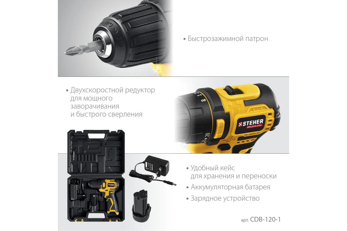 Дрель-шуруповерт STEHER CDB-120-1 Бесщеточный 12В 1х2Ач кейс