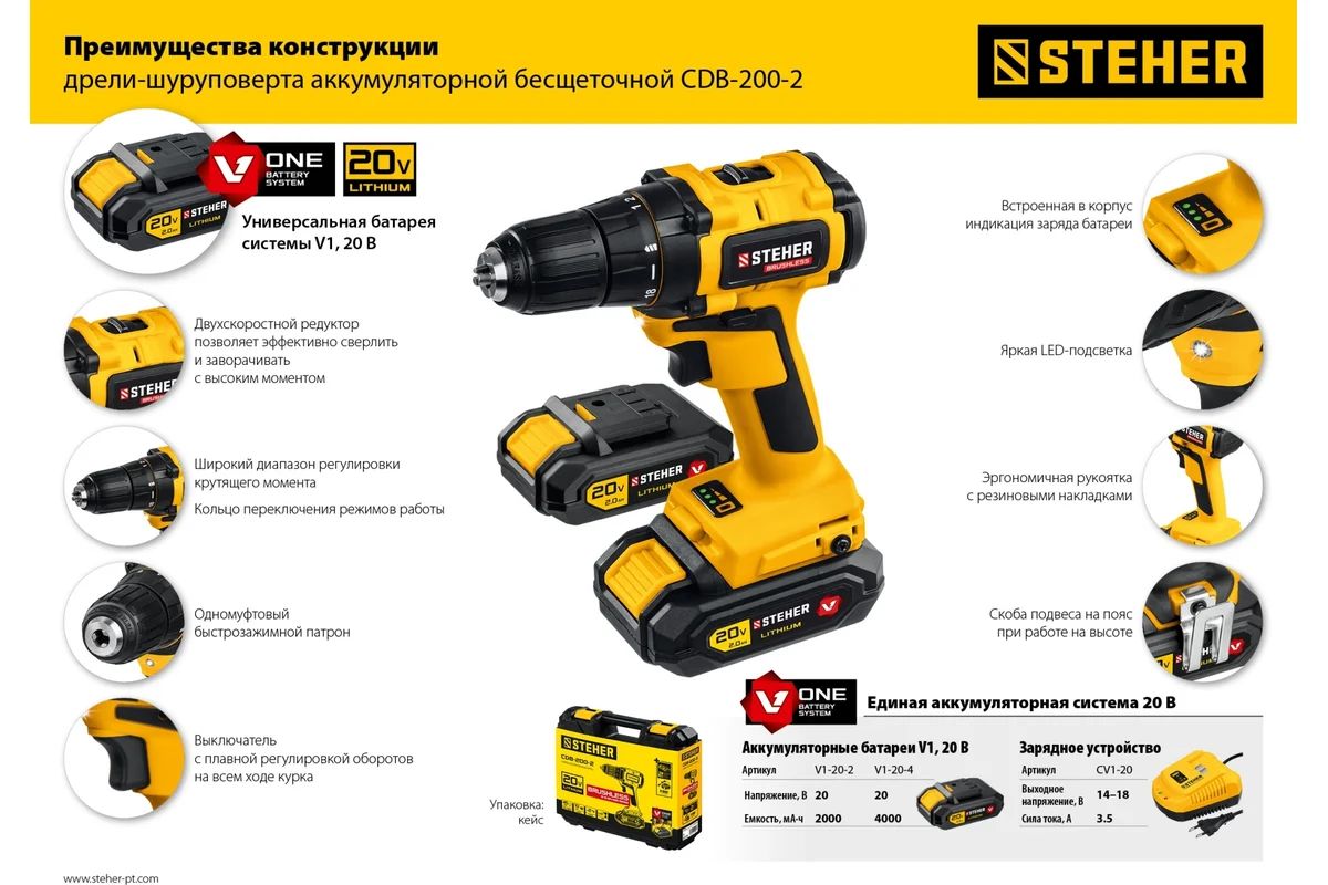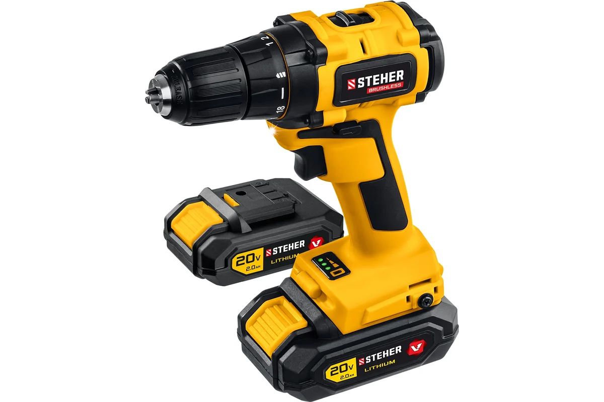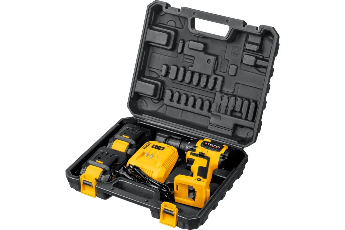 - Два аккумулятора в комплекте STEHER CDB-200-2 – для продолжительных работ без простоев
