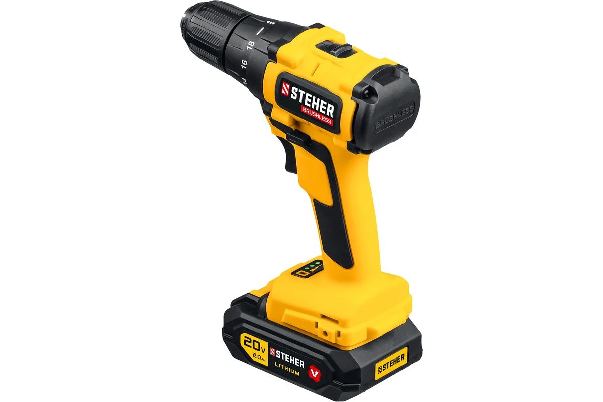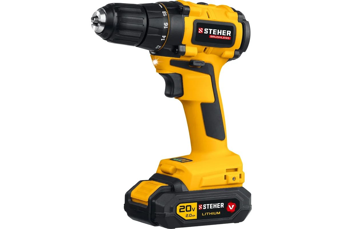 Бесщеточная дрель-шуруповерт STEHER CDB-200-2 используется для сверления отверстий в различных материалах (при установке сверла), а также для вкручивания и выкручивания шурупов, саморезов и винтов (при установке соответствующих бит).