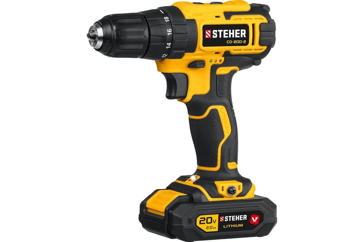 Дрель-шуруповерт STEHER 20В, 2 АКБ 2Ач CD-200-2 предназначен для сверления отверстий в различных материалах, для монтажа и демонтажа резьбовых соединений.