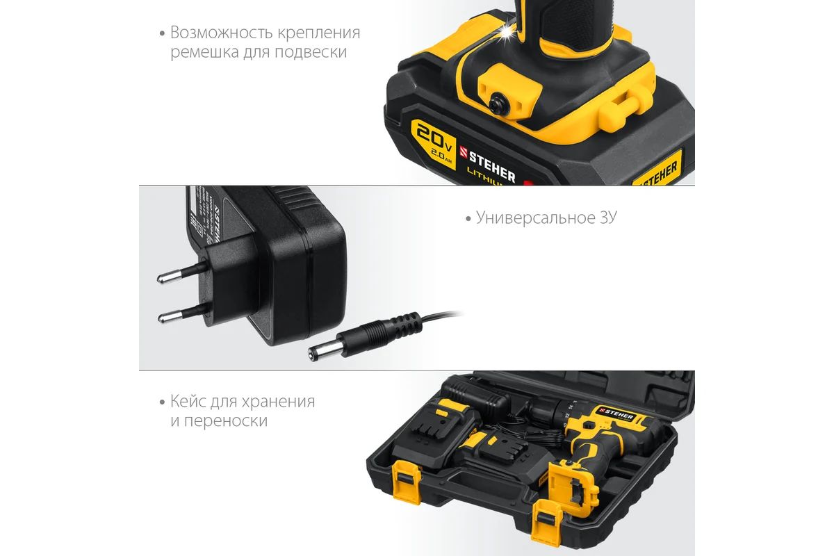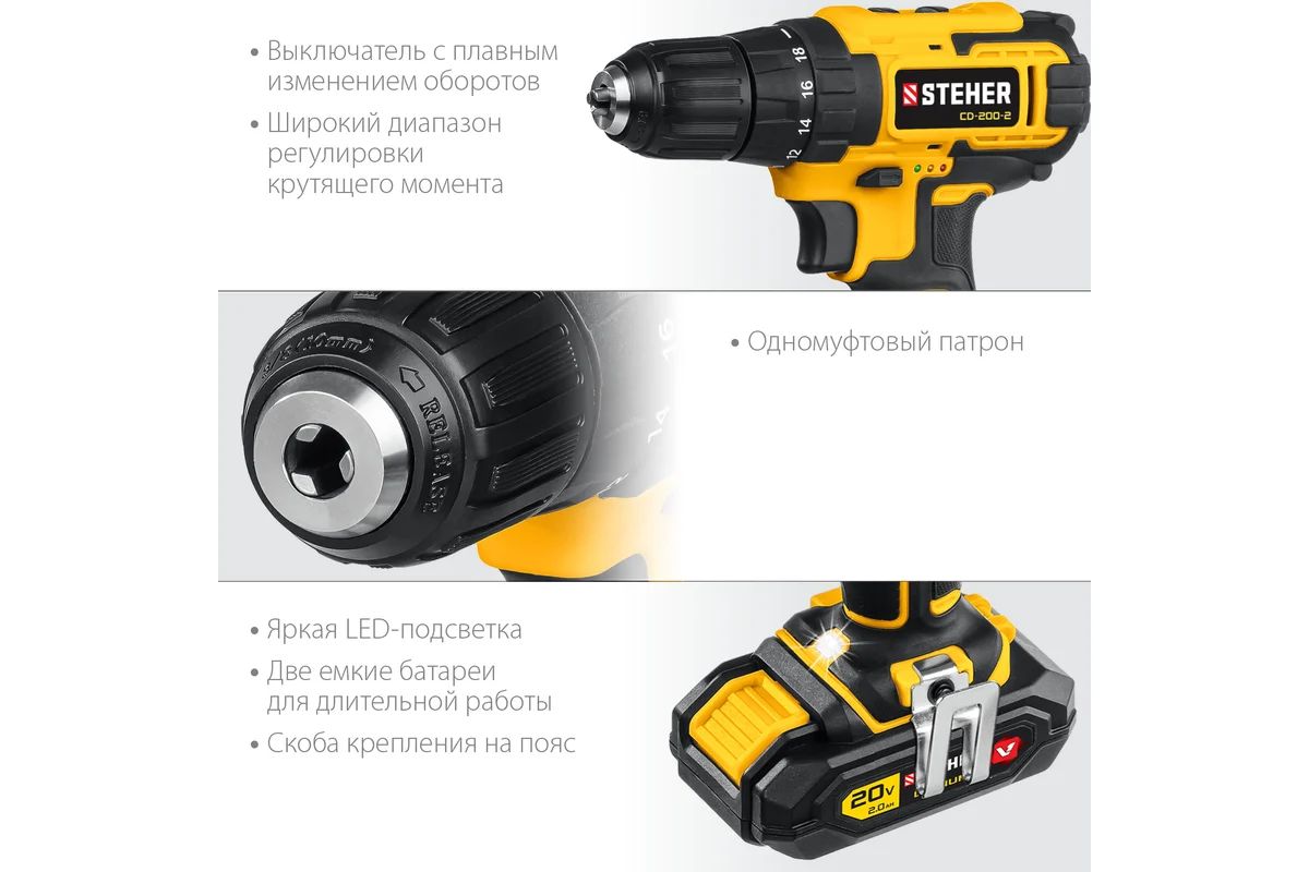- Два аккумулятора в комплекте STEHER 20В CD-200-2– для продолжительных работ без простоев