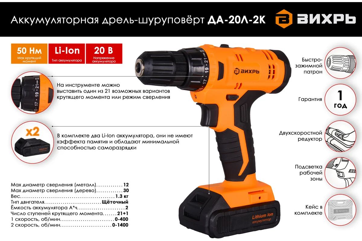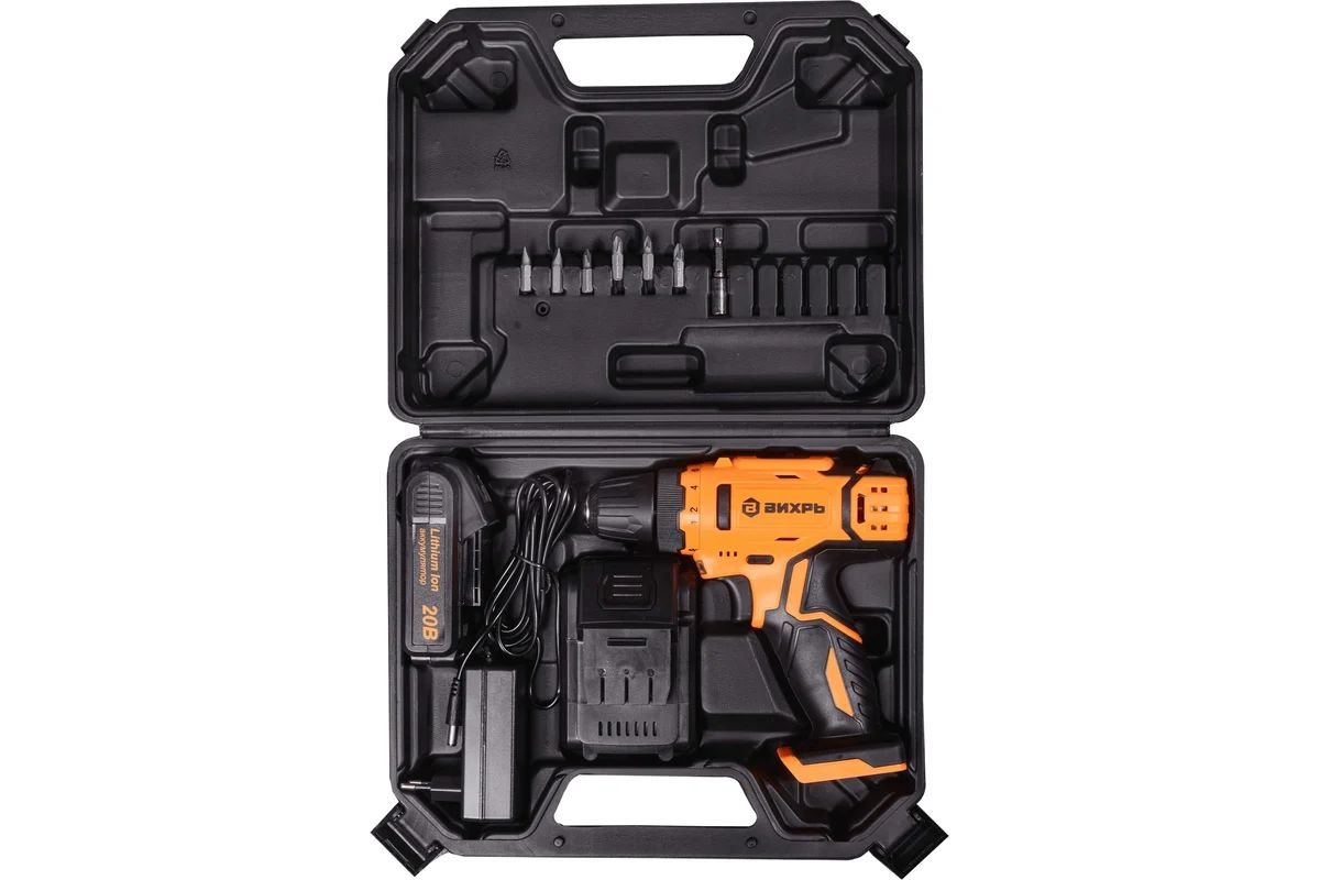 - Удобный кейс решает вопрос хранения и транспортировки Вихрь ДА-20Л-2К 2.0 А/ч 72/14/21.