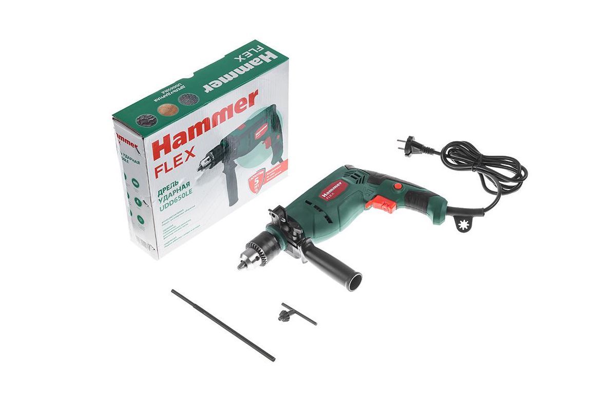HAMMER UDD650LE – сетевая дрель с ударным режимом. Подходит для сверления дерева, металла, пластика, а также для работы с твёрдыми материалами: кирпичом, бетоном камнем. Также пригодится, чтобы выкрутить или вкрутить крепёж: шурупы, саморезы, винты.