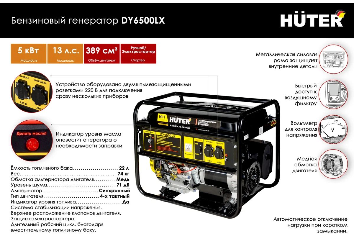 Электрогенератор Huter DY6500LX - устройство для питания электрооборудования вдали от населенных пунктов, на стройплощадке или в случаях отключения электричества. Вырабатывает до 5 кВт электроэнергии. Оснащен мощным четырехтактным двигателем с верхним расположением клапанов. Агрегат оборудован датчиками уровня топлива и масла для своевременной дозаправки. Специальные резиновые стойки уменьшают вибрацию электрогенератора при работе.