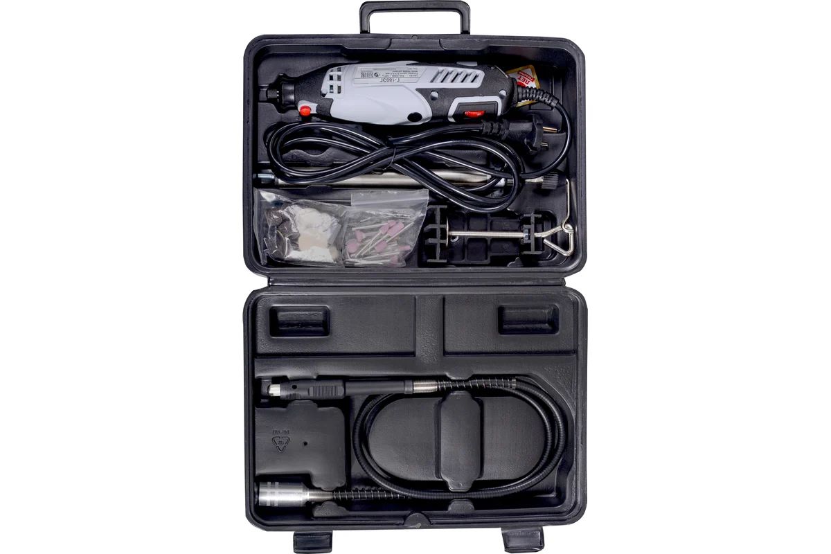 - Гибкий вал позволяет более комфортно работать с мелкими деталями, есть стойка для удобного хранения