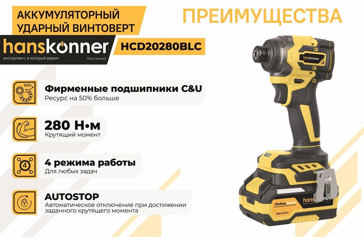 Импакт Hanskonner HCD20280BLC 18В 280Нм Бесщеточный 1х4Ач кейс HS
