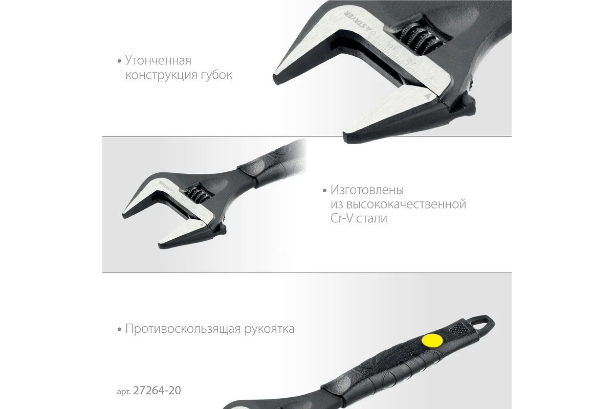 Ключ разводной STAYER 27264-20, применяется для монтажа и демонтажа крепежных элементов, имеющих шестигранный профиль. Ключ предназначен для завинчивания гаек, болтов и других деталей.