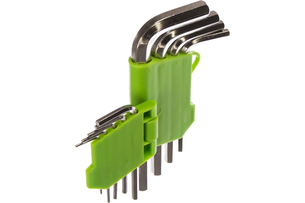 Набор коротких имбусовых ключей Сибртех 12317, из закаленной стали 45Х, 9 шт., никель, используется для работы с евровинтами, имеющими шлиц HEX в виде внутреннего шестигранника. В комплекте 9 ключей размером от 1,5 до 10 мм, поэтому он обладает широкими возможностями применения. Набор пригодится при сборке мебели, для ремонта велосипедов, установки и регулировки пластиковых окон.
