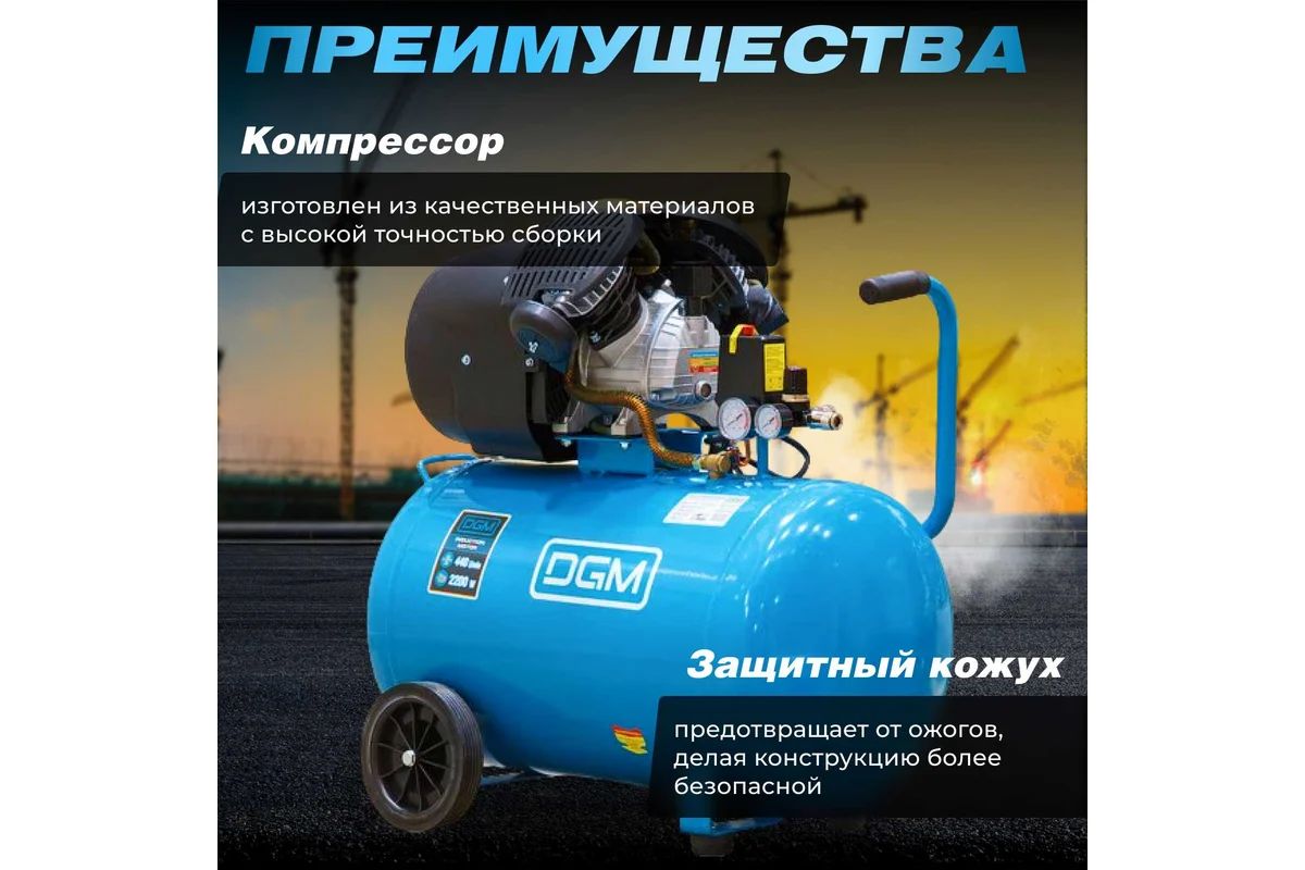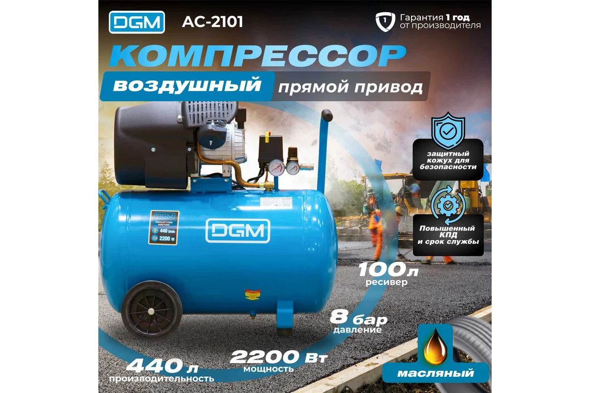Компрессор DGM AC-2101 представляет собой мощный инструмент для производства сжатого воздуха. Прямой привод в сравнении с ременным генерирует минимальный уровень шума. Это позволяет безопасно работать даже в помещении.