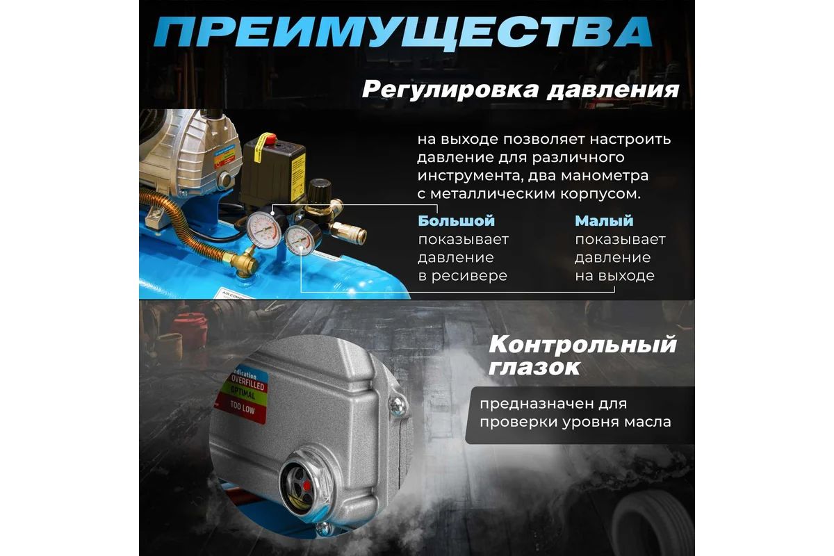 Двойной манометр позволяет отслеживать уровень давления на выходе с компрессора и входе в инструмент. Дополнительно можно установить фильтр для очистки от масла - увеличит ресурс подключаемого оборудования.