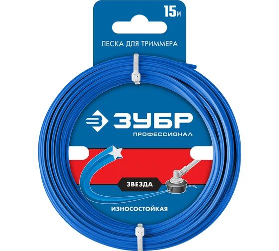 Леска для триммера Профессионал износостойкая (3.0 мм; 15 м; звезда) ЗУБР 71020-3.0 - качественная быстрорежущая леска для кошения растительности на приусадебном участке. Благодаря острым граням, имеет высокую эффективность. Острые грани сечения "звезда" легко прорезают материал, чем увеличивают производительность. Подходит для грубой растительности, оптимальна для кошения толстой и сухой травы. Запаса длины хватает на три заправки. Совместима с электрическими и бензиновыми триммерами.