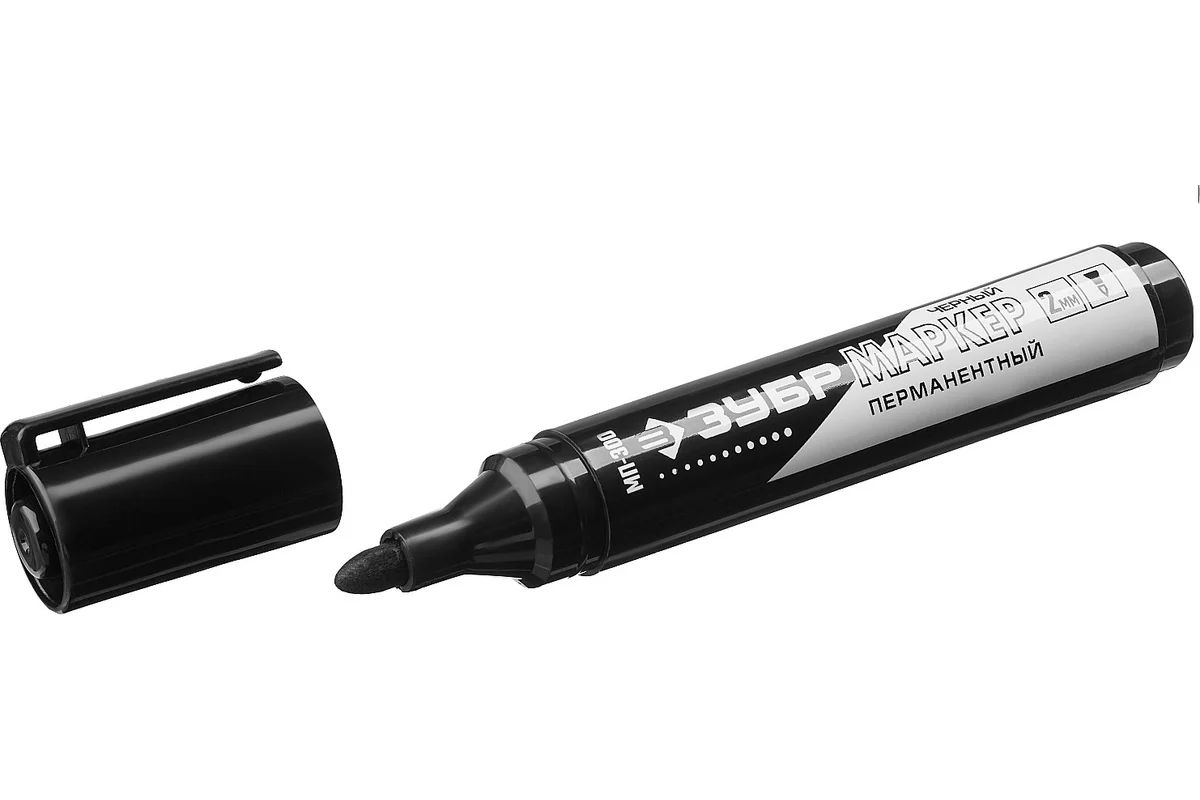 Перманентный маркер Зубр МП-300 черный, заостренный наконечник 06322-2 пишет на различных поверхностях - картон, пластик, стекло, бумага. Инструмент применяется в различных сферах.