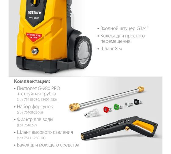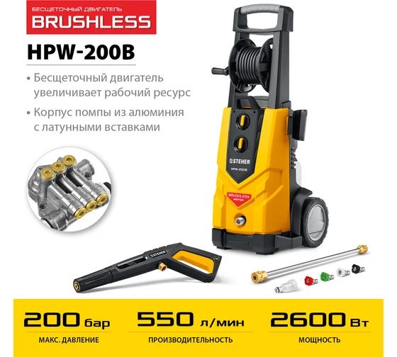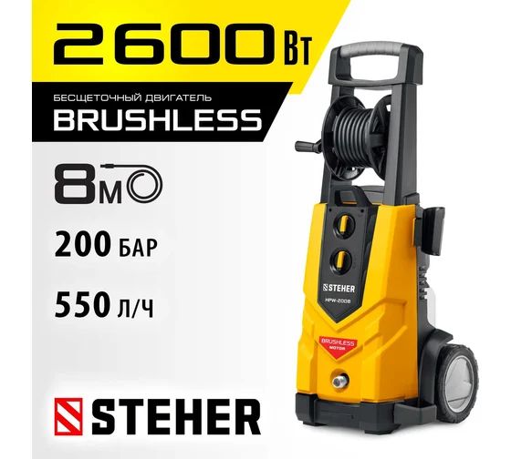 Мойка высокого давления STEHER 200 атм, 2600 Вт HPW-200B - профессиональная мойка высокого давления, оснащенная бесщеточным двигателем с низкими оборотами и высоким крутящим моментом, используется как для бытовых нужд, так и в сфере клининга или на профессиональной автомойке.