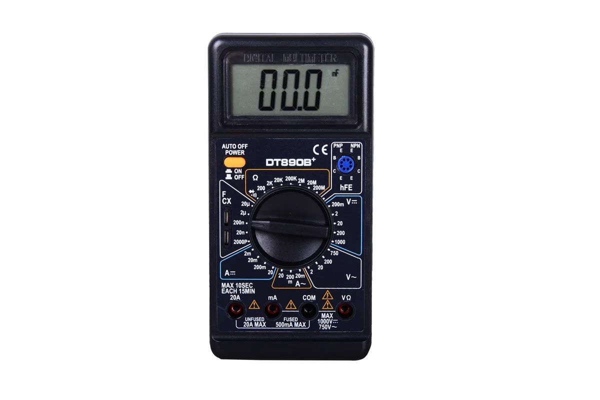 Компактный, износостойкий, 3 1/2 - разрядный мультиметр DT890B+ предназначен для измерения постоянного и переменного напряжения, постоянного и переменного тока, сопротивления, емкости, проверки диодов, транзисторов, звуковой прозвонки. Метод измерений - АЦП двойного интегрирования с автоматической коррекцией нуля, автоматическим определением полярности и индикацией перегрузки.
