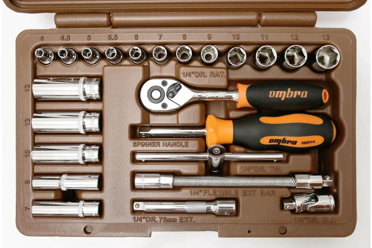 Набор головок 1/4" DR 23 предмета Ombra 911423 предназначен для различных крепежных работ. В удобном кейсе расположено 23 предмета, среди которых 17 различных торцевых головок. Инструменты изготовлены из легированной стали.