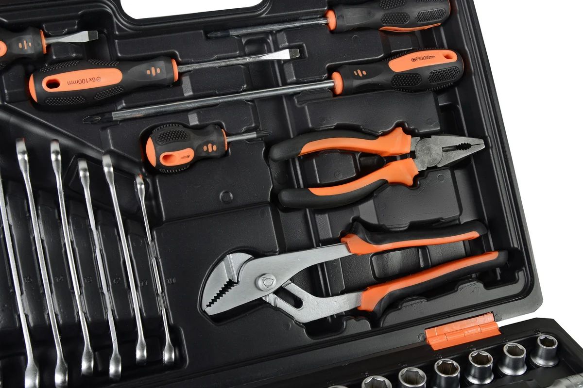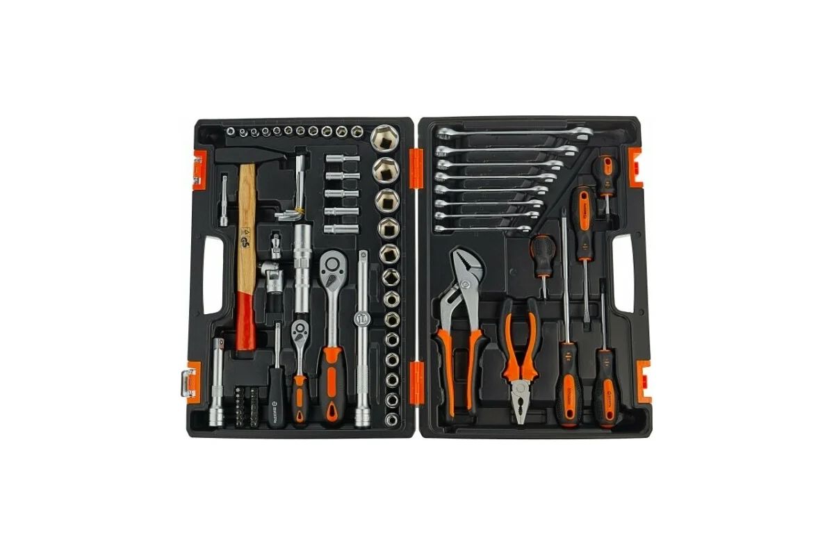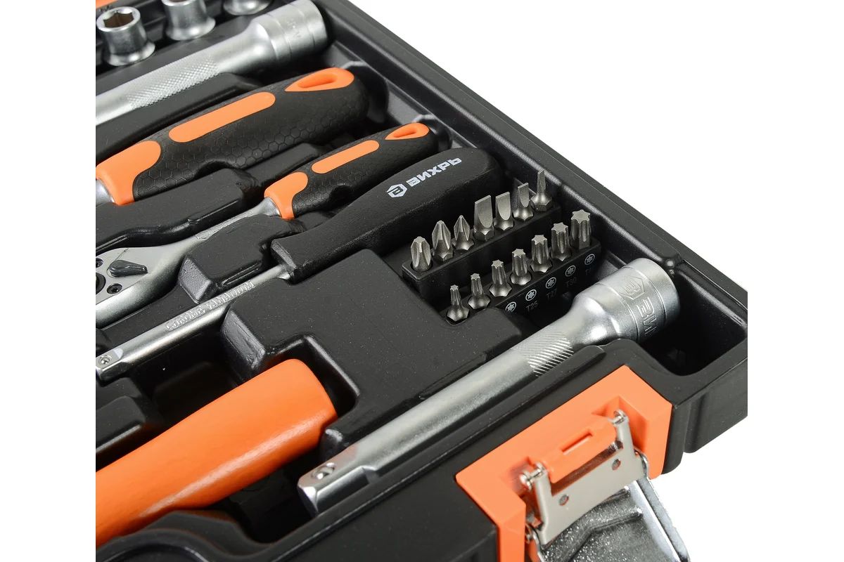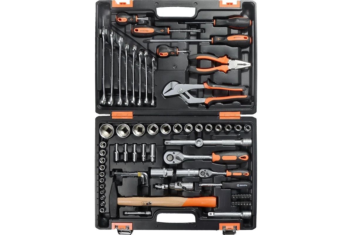 Набор инструмента ВИХРЬ предназначен для ремонта автомобилей, мотоциклов, садовой и другой техники. Подходит как для использования на станциях технического обслуживания, так и в бытовом применении дома или на даче. Инструмент изготовлен в соответствии с международными стандартами. Головки и комбинированные ключи изготовлены из хромованадиевой стали, придающей инструменту высокую твердость и легкость. Биты, биты-вставки и отвёртки производятся из стали S2, улучшающей характеристики крутящего момента и твёрдости. Все наборы упакованы в кейс, изготовленный из жесткого противоударного пластика, с металлическими застёжками.