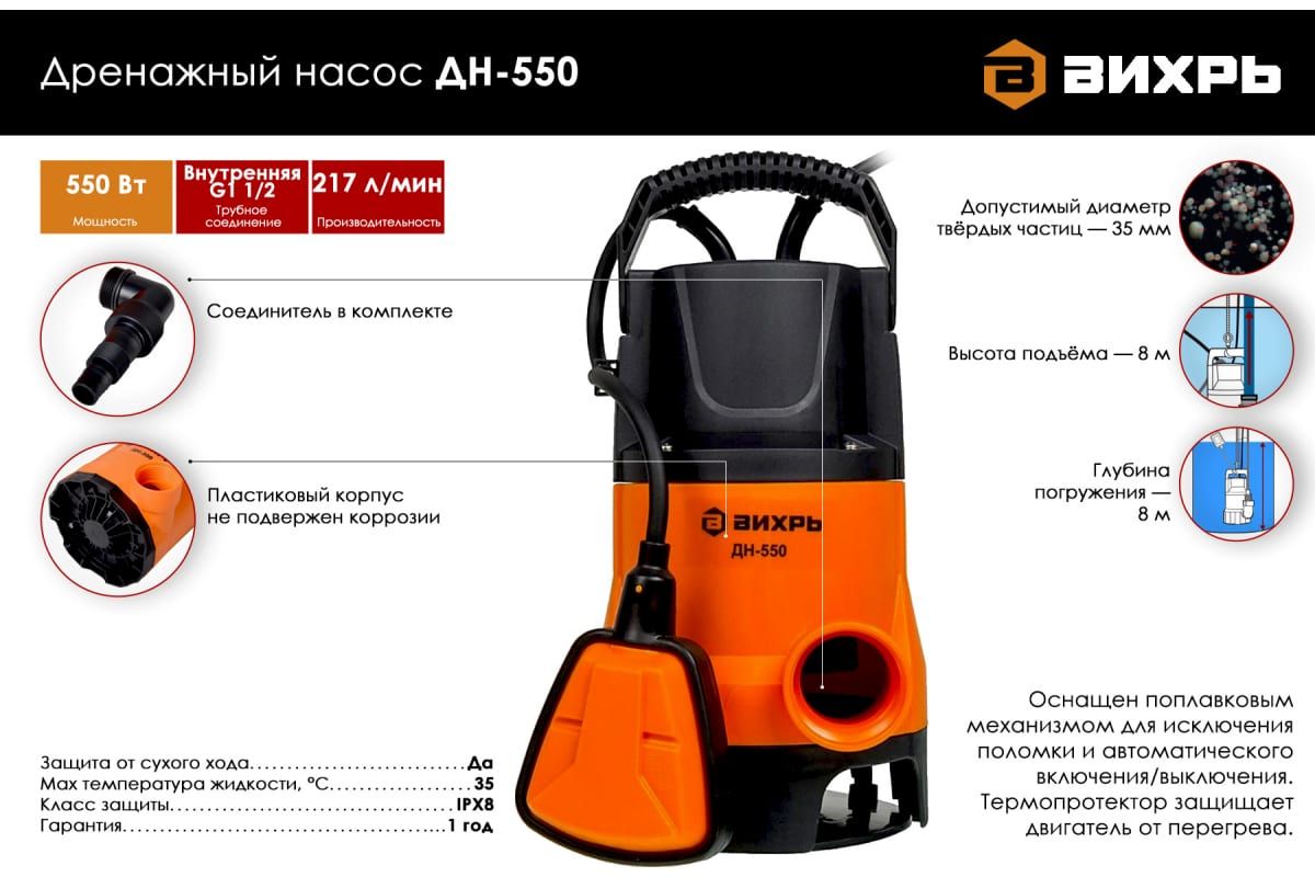 Дренажный насос Вихрь ДН-550 позволит своевременно и быстро откачать в меру грязную воду из подвала, водоема, шахты, сливной ямы. Простая и надежная конструкция и небольшая стоимость делают его популярным и широко применимым среди владельцев загородных домов и коттеджей.