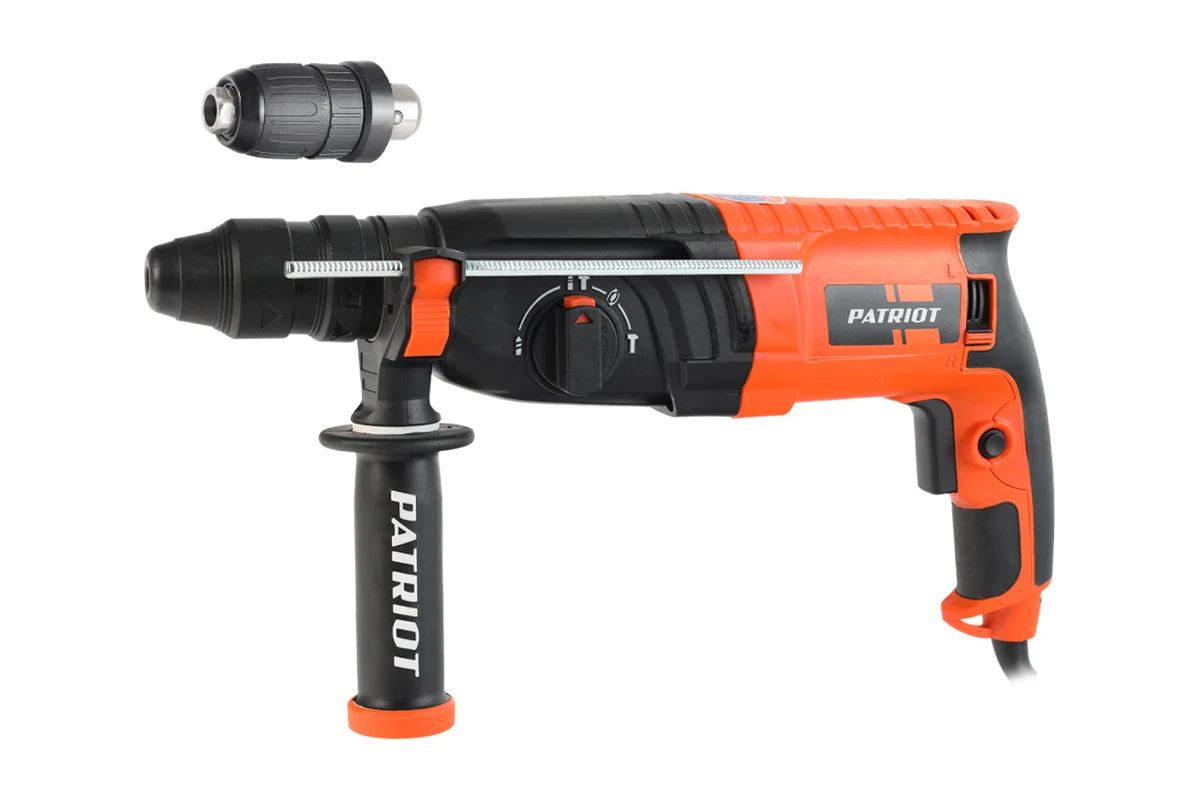 Перфоратор Patriot RH 265Q 140301330 оснащен быстросменным патроном QCC, который снижает люфт и биение в режиме сверления. На выбор имеются три режима работы: удар, сверление, сверление с ударом. Также есть режим поворота долота. Если бур заклинивает, патрон перестает вращаться, что обеспечивает защиту оператора. Имеется быстрый доступ к угольным щеткам - для самостоятельной их замены.