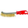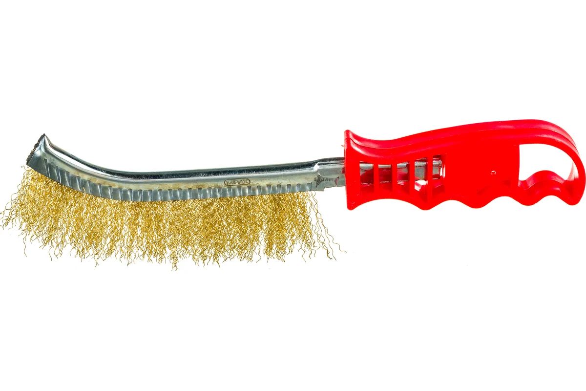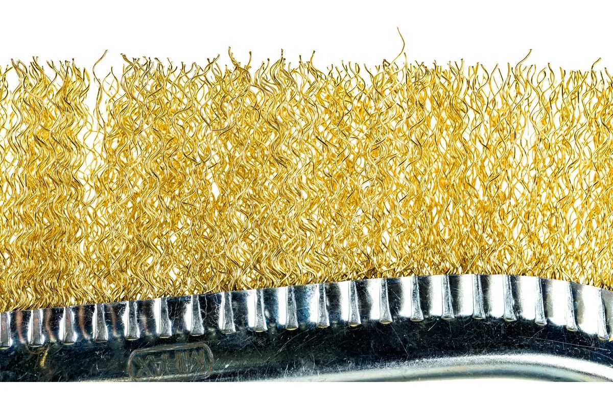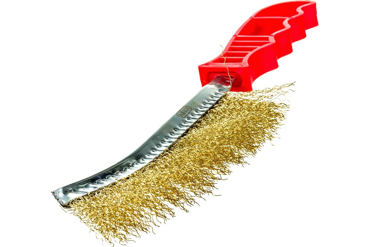 Ручная латунированная щетка MIRAX 35112-1 используется для очистки различных поверхностей от старых лакокрасочных материалов, а также от ржавчины и других видов загрязнений. Инструмент отличается надежным исполнением.
