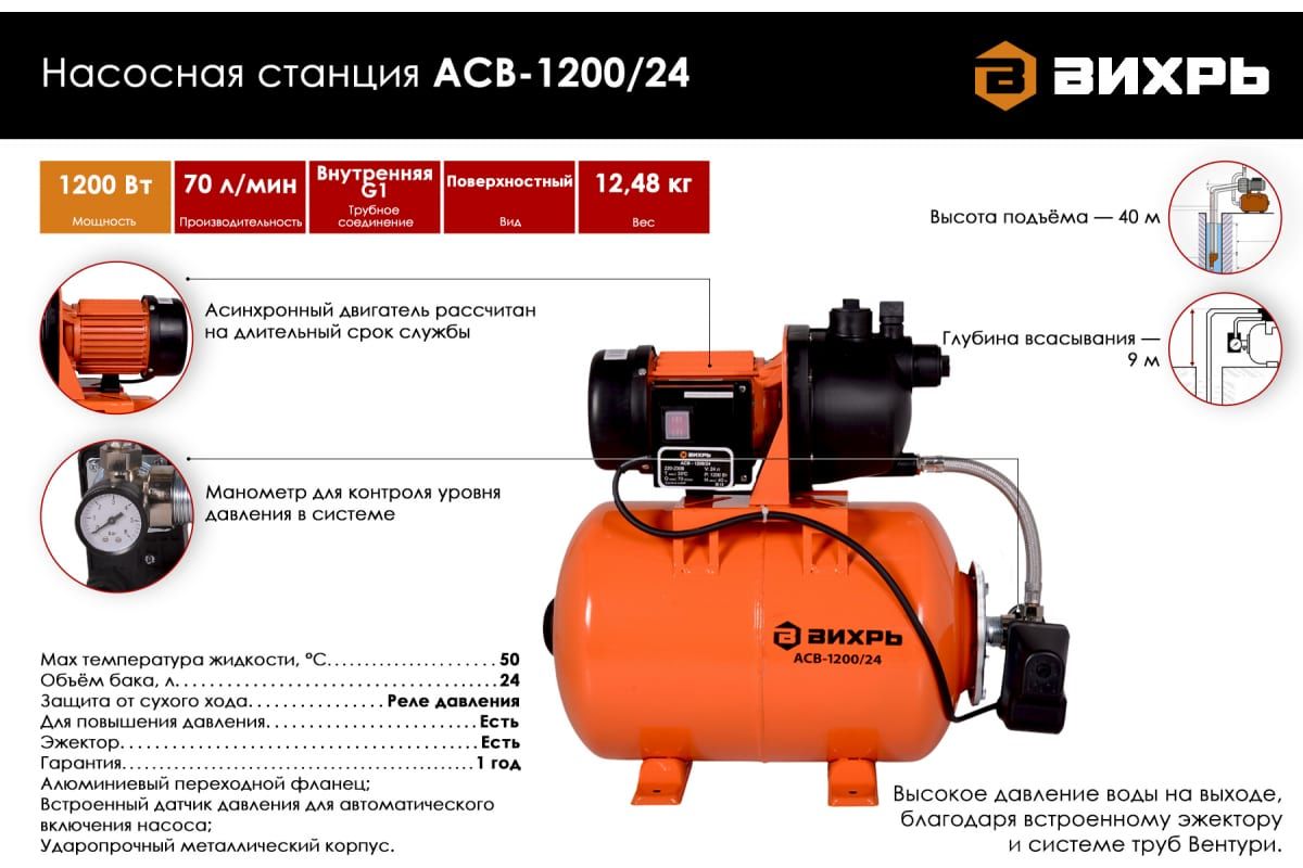 Автономная станция водоснабжения питается от электросети и обладает мощностью 1200 Вт, при этом с её помощью можно поднять воду из скважины на высоту до 40 м. При оптимальных условиях эксплуатации производительность данной модели достигает 70 л/мин. Станция оснащена металлическим гидроаккумулятором, вмещающим до 24 л., что делает её надёжной и удобной для использования в автономном режиме. Для безопасности станция Вихрь АСВ 1200/24 дополнительно оборудована защитой от перегрева, которая срабатывает, если вода в источнике закончилась и работу насоса нужно прервать.