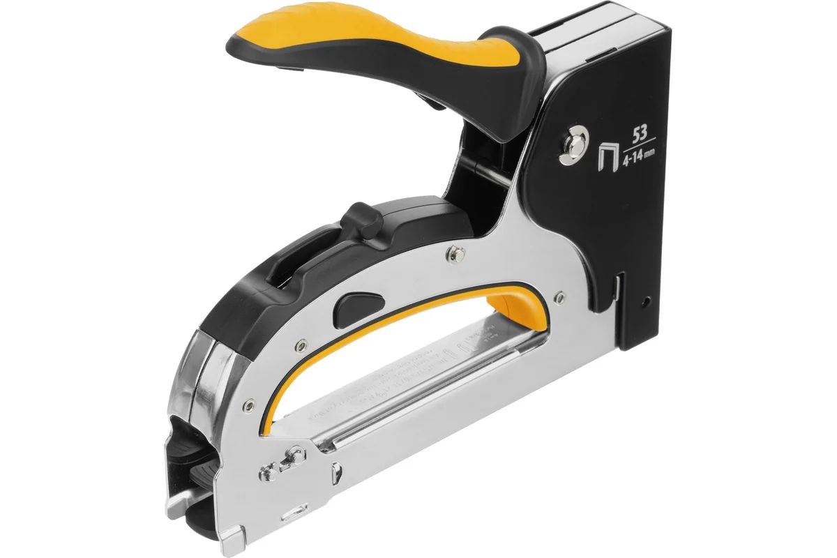 Степлер строительный используется для легкого и быстрого скрепления между собой различных материалов (например, ткани и дерева/пластика). В качестве расходных материалов используются скобы типа 53. Инструмент пригодится для обивки мебели, укладки напольных покрытий, выполнения ремонтных и багетных работ.