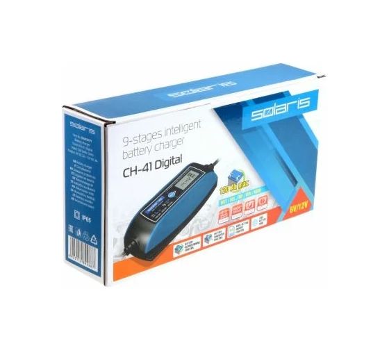 Зарядное устройство SOLARIS CH-41 Digital CH41D171 предназначено для зарядки аккумуляторов различных типов (WET, GEL, MF, EFB, AGM) автомобилей, грузовиков, мотоциклов, моторных лодок, садовых тракторов с бортовой сетью 6В или 12В.